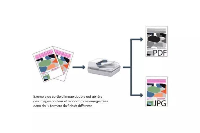 La sortie d’image double permet de créer deux fichiers différents pour une seule numérisation, par exemple, une version couleur et une version monochrome. Vous serez en mesure de définir des paramètres distincts pour :